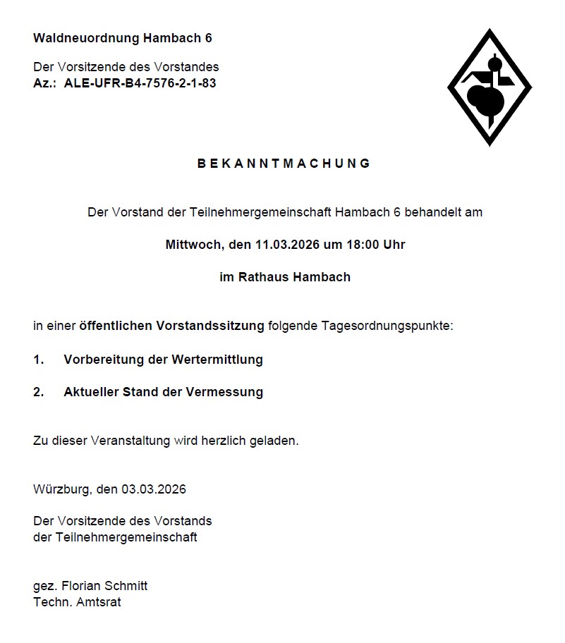 Bekanntmachung zur bevorstehenden Vorstandssitzung im Rahmen der Waldneuordnung Hambach 6