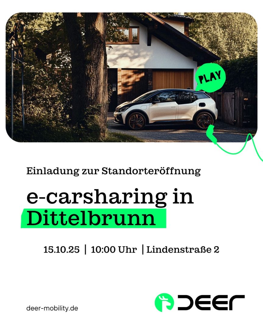 Seit dem 15. Oktober 2025 können alle in der deer App registrierten BürgerInnen mit einer Ladesäule in Dittelbrunn die mobile Freiheit des deer e-carsharings genießen und so flexibel und nachhaltig von A nach B fahren.