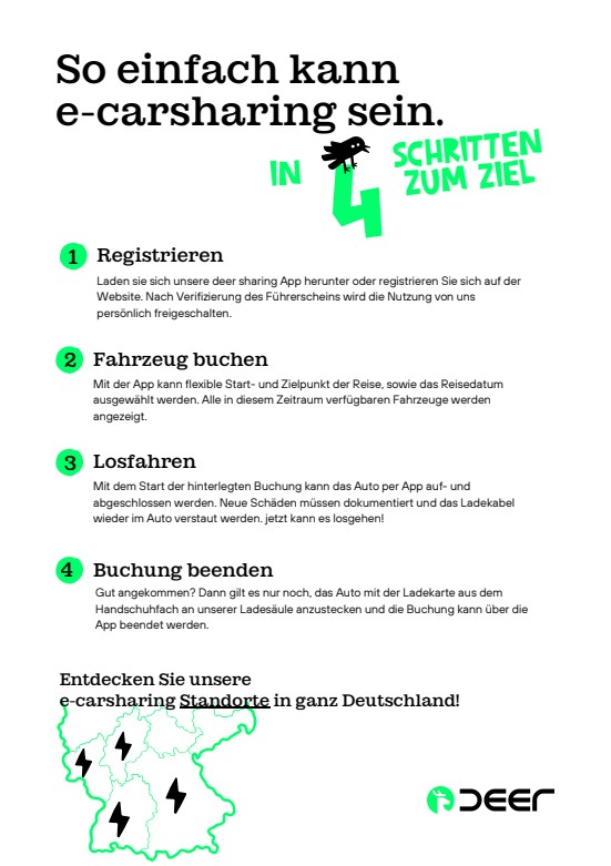 Jede Fahrt mit einem der 1000 deer e-Fahrzeuge im 30-Minuten-, Stunden-, Tages- oder Wochenend-Tarif kann innerhalb des deer-Mobilitätsnetzes in Baden-Württemberg, Bayern, Rheinland-Pfalz und Hessen an jeder der 1286 Ladepunkte an 434 Standorten beginnen und enden. Dank des stationsflexiblen Modells sind auch Einwegfahrten ohne Probleme möglich und das eigene Auto kann zuhause bleiben, Kosten werden gespart und die Umwelt geschont. Die sichere Reichweite des Autos für die nachkommenden KundInnen, ebenso wie ein sicherer Parkplatz an der Ladesäule ohne Zusatzkosten ist gewährleistet.
