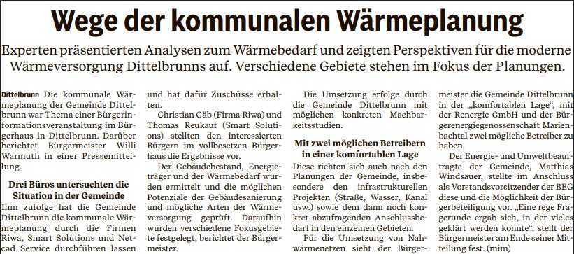 Ein Konsortium aus den Dienstleistern RIWA GmbH, netCADservice GmbH und Smart Solutions Management Consulting erstellen gemeinsam mit der Gemeinde Dittelbrunn einen kommunalen Wärmeplan. Er bildet die Grundlage für die Wärmewende in den beteiligten Ortsteilen. Das Projekt startet im Dezember und soll im Frühsommer 2025 abgeschlossen sein.  Das Projekt wird durch das Bundesministerium für Wirtschaft und Klimaschutz gefördert.