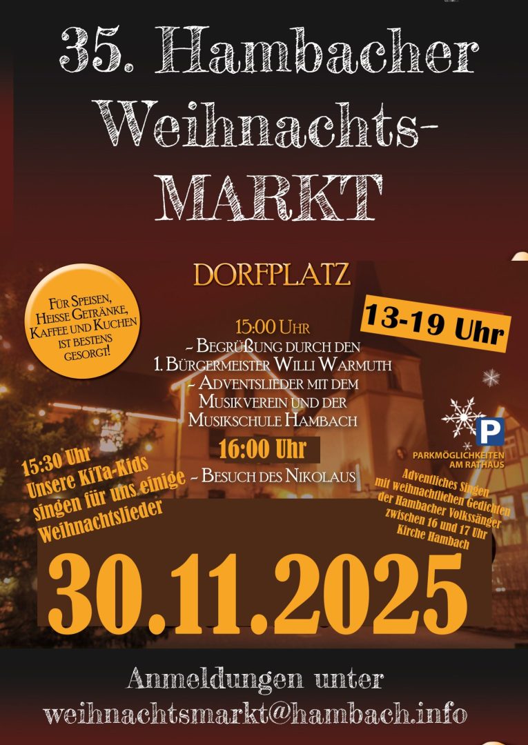 KategorieGemeinde Datum30 Nov. 2025 Uhrzeit 13:00 - 19:0035. Hambacher WeihnachtsmarktTeile diese Veranstaltung+ Zu Google Kalender hinzufügen+ iCal / Outlook exportieren