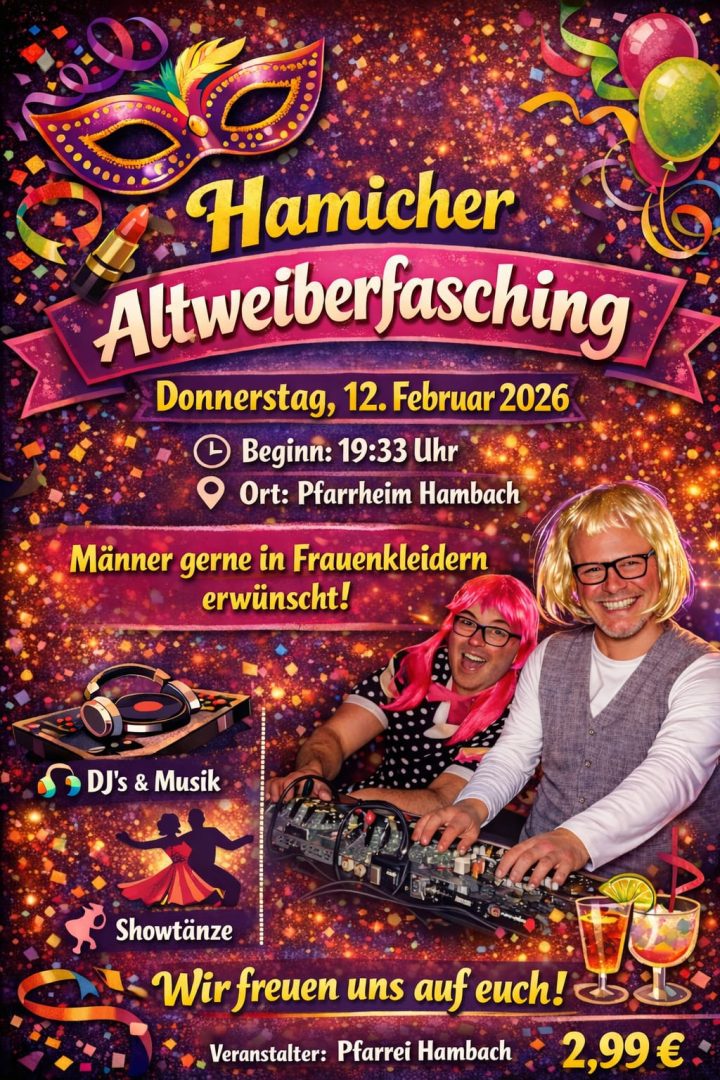 Veranstalter Pfarrei Hambach VeranstaltungsortPfarrheim HamabchHambach KategorieAndere Stellen und BehördenGemeinde Datum12 Feb. 2026 Uhrzeit 19:30 - 19:30Hamicher AltweiberfaschingTeile diese Veranstaltung+ Zu Google Kalender hinzufügen+ iCal / Outlook exportieren