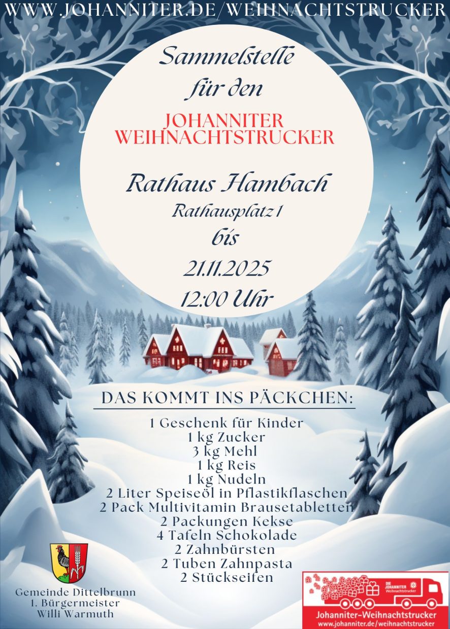 KategorieGemeinde Datum27 Okt. 2025 - 21 Nov. 2025laufend Uhrzeit 08:00 - 18:00Johanniter Weihnachtstrucker SammelaktionTeile diese Veranstaltung+ Zu Google Kalender hinzufügen+ iCal / Outlook exportieren