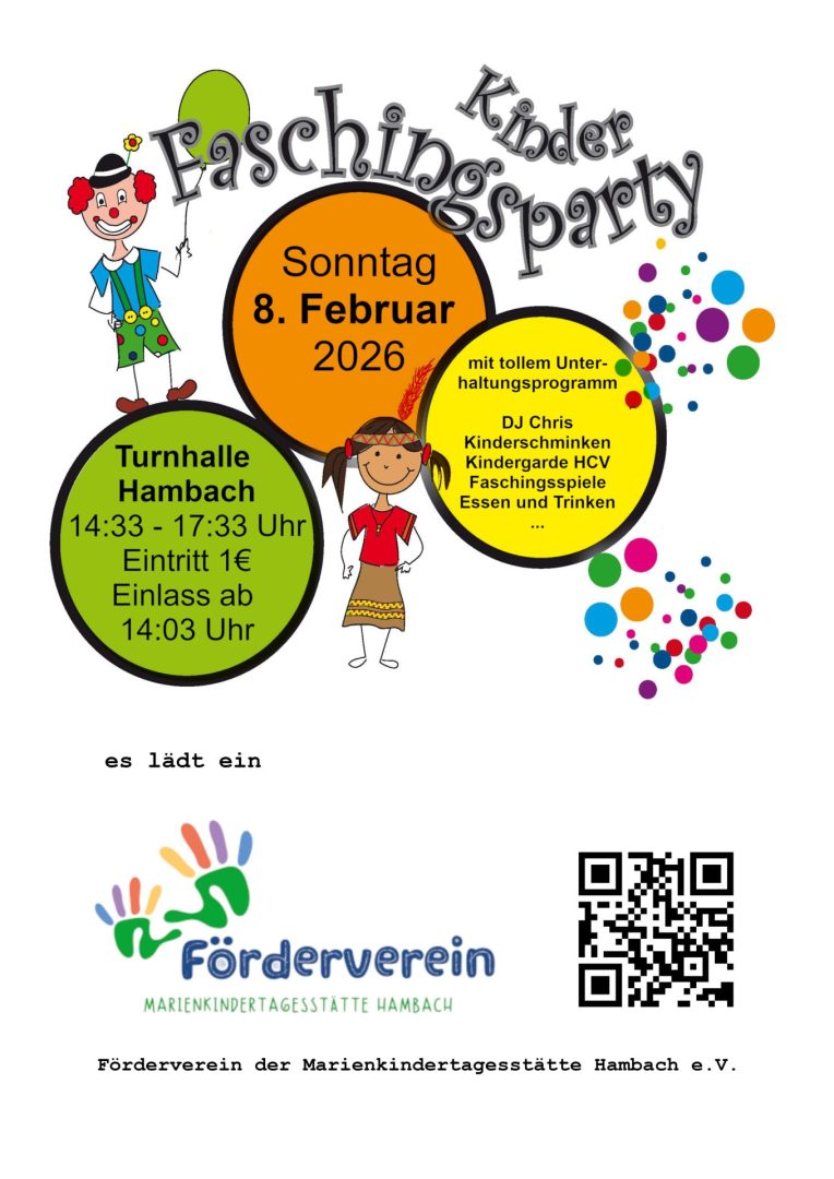 Veranstalter Marienkindertagesstätte Hambach und der Förderverein Marienkindertagesstätte Hambach VeranstaltungsortTurnhalle - Schule HambachSteinbergstraße 12, 97456 Dittelbrunn KategorieAndere Stellen und BehördenGemeinde Datum08 Feb. 2026 Uhrzeit 14:30 - 17:30Kinder Faschingsparty der Marienkita HambachTeile diese Veranstaltung+ Zu Google Kalender hinzufügen+ iCal / Outlook exportieren