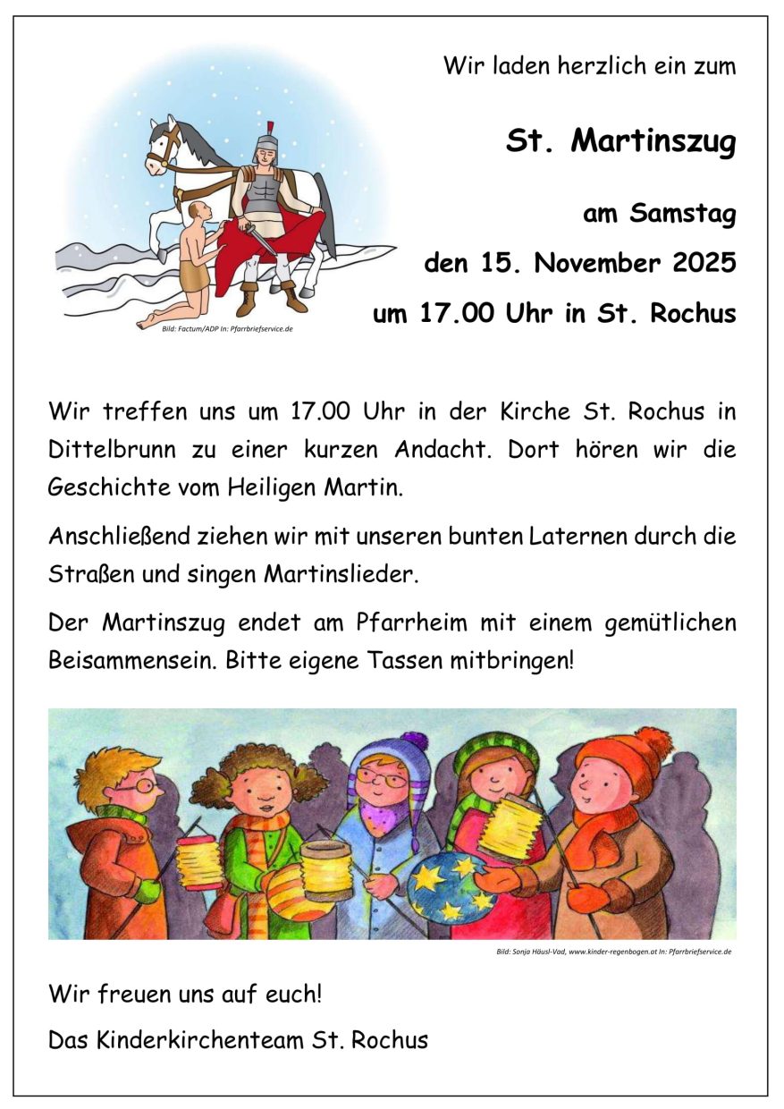 KategorieGemeinde Datum15 Nov. 2025 Uhrzeit 17:00 - 18:00Kinderkirche St. Rochus – Einladung zum MartinsumzugTeile diese Veranstaltung+ Zu Google Kalender hinzufügen+ iCal / Outlook exportieren