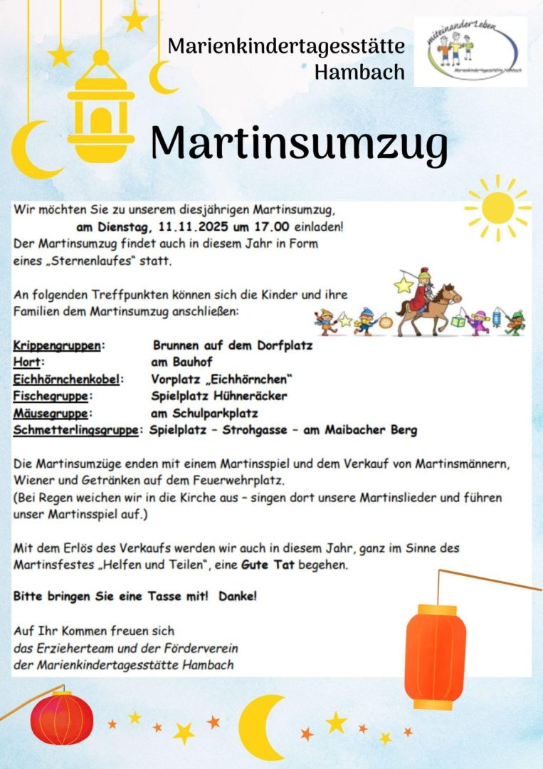 KategorieGemeinde Datum11 Nov. 2025 Uhrzeit 17:00 - 18:00Martinsumzug der Marienkindertagesstätte HambachTeile diese Veranstaltung+ Zu Google Kalender hinzufügen+ iCal / Outlook exportieren