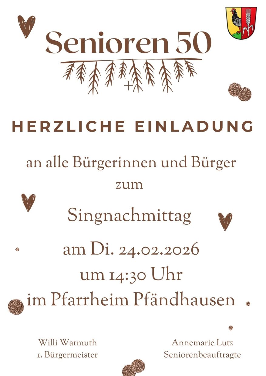 Veranstalter Senioren 50+ E-Mail info@dittelbrunn.de VeranstaltungsortPfarrheim PfändhausenKirchenstraße KategorieGemeinde Datum19 Jan. 2026 - 24 Feb. 2026laufend Uhrzeit 08:30 - 23:00Herzliche Einladung zum Singnachmittag der Senioren 50+Teile diese Veranstaltung+ Zu Google Kalender hinzufügen+ iCal / Outlook exportieren