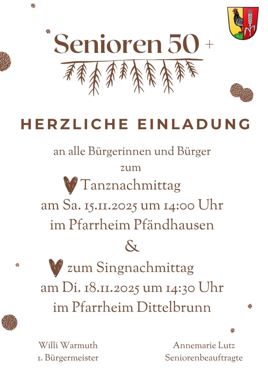 KategorieGemeinde Datum15 - 18 Nov. 2025 Uhrzeit 14:00 - 18:00Termine der Senioren 50+Teile diese Veranstaltung+ Zu Google Kalender hinzufügen+ iCal / Outlook exportieren