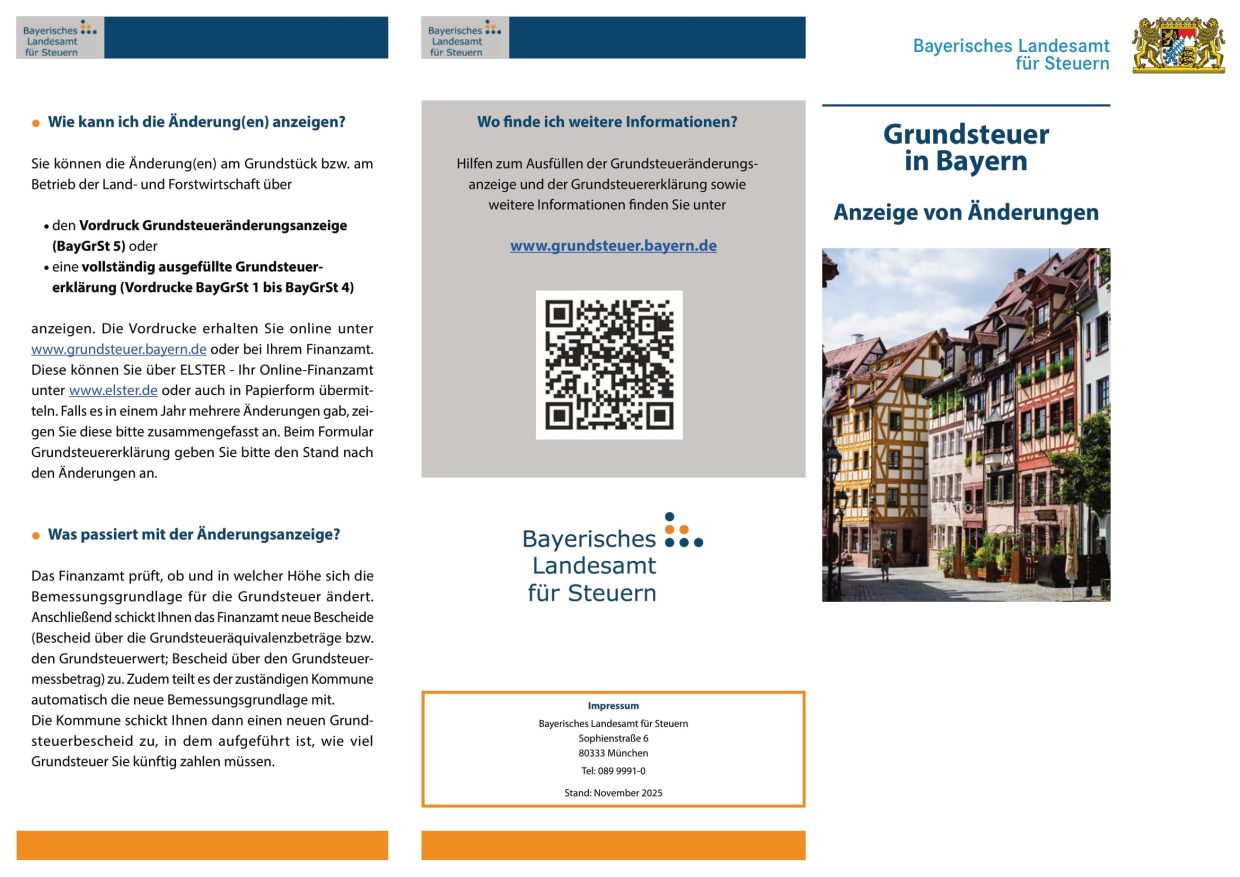 Da die Anzeige von Änderungen durch die Steuerpflichtigen ein wesentliches Instrument ist, um die Grundsteuer Bemessungsgrundlagen aktuell zu halten, verweisen wir auf den neu eingetroffenen Flyer des Bayerischen Landesamtes für Steuern hin. Diesen finden Sie im weiteren Verlauf unten aufgeführt.