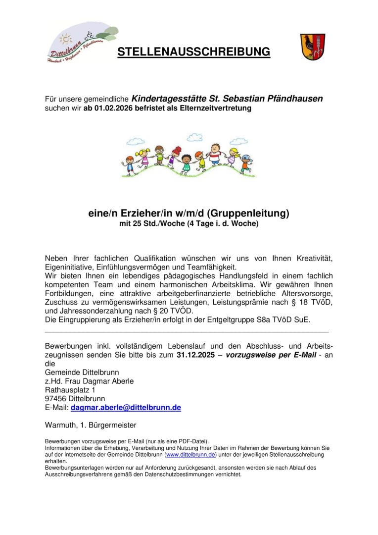 Stellenausschreibung – Kita Pfändhausen – Erzieher/in (m/w/d)